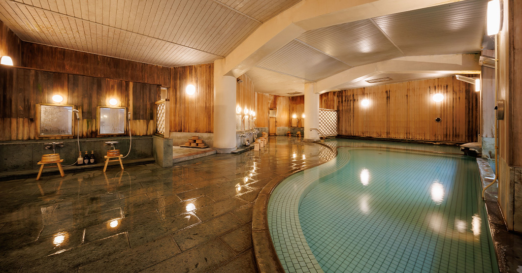 なみなみと溢れる湯に心なごむ東雲風呂。温泉蒸し風呂、露天風呂、檜桶ジャグジーバスも併設しています。