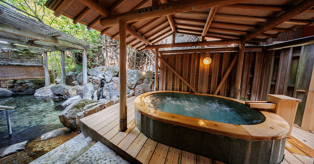 隣接のよろづやの大浴場「桃山風呂」・「東雲風呂」・サウナ併設の貸切「プライベートスパ梵」(要予約)をご利用いただけます。