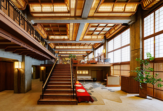 狩野派の屏風絵が圧巻の広々としたロビースペースです。お待ち合わせや談話室としてもご利用ください。